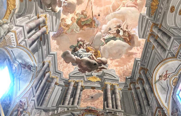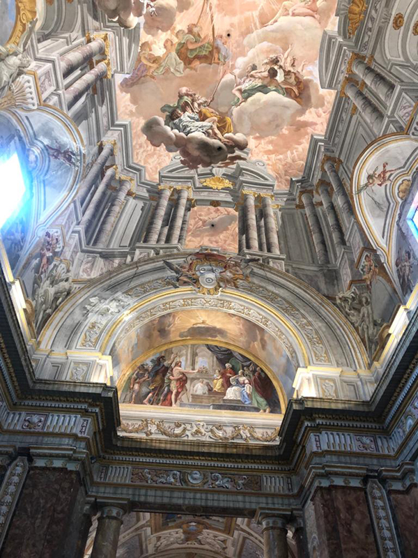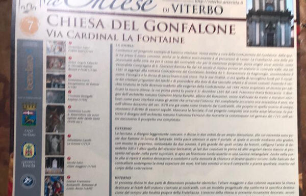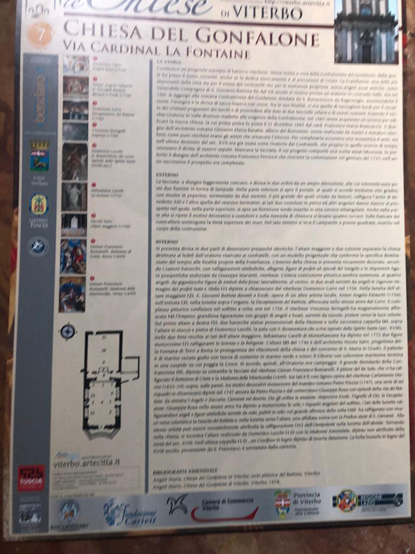 La  chiesa è un pregevole esempio di barocco viterbese. Venne eretta a cura della Confraternita del Gonfalone, dalla quale ha preso il nome corrente custodita dalla stessa confraternita di cui è priore Franco Chiaravalli, che riunisce tutti i confratelli che oltre ai cerimoniali curano la chiesa con dovizia. Al nostro ingresso abbiamo incontrato Sergio Gentili, un confratello che si è prestato con passione a farci da narratore e guida. Abbiamo insieme a lui ammirato l’effetto delle colonne dipinte sul soffitto, creano un gioco di prospettiva incredibile: si accorciano se vi avvicinate e si inclinano se vi spostate su un lato. Fu nel 1756 che il viterbese Vincenzo Strigelli coadiuvato da Giuseppe Marzetti. ha magistralmente affrescato L’Empireo, grandiosa figurazione con gruppi di angeli e beati, sorretti da nuvole, protesi verso la luce.