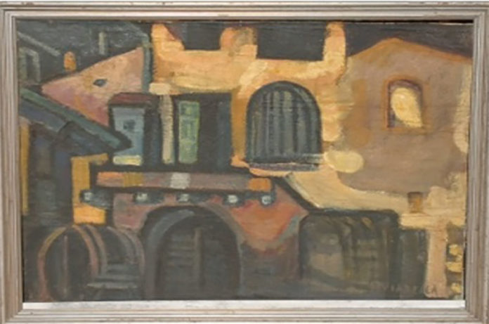 Era facile incontrarlo mentre passeggiava per le vie di Viterbo e coglierlo mentre univa il pollice e l’indice delle due mani per aprire una finestrella, quello che riusciva a vedere all’interno lo ispirava per elaborare l’opera che poi dipingeva su tela di juta con un pennello duro e rigido contrastando i colori giallo e ocra all’interno di una composizione lineare.
