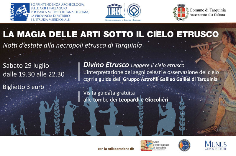 SABATO 29 luglio 2017 ore 19.30-22.30 per la rassegna “la Magia delle Arti sotto il cielo etrusco. Notti d’estate alla necropoli etrusca di Tarquinia”, un appuntamento con l’osservazione e l’interpretazione dei misteriosi segni del cielo.