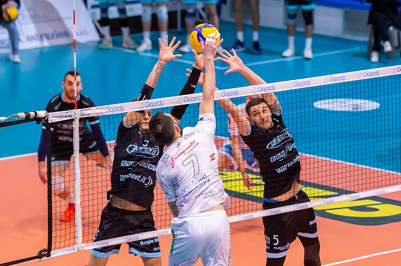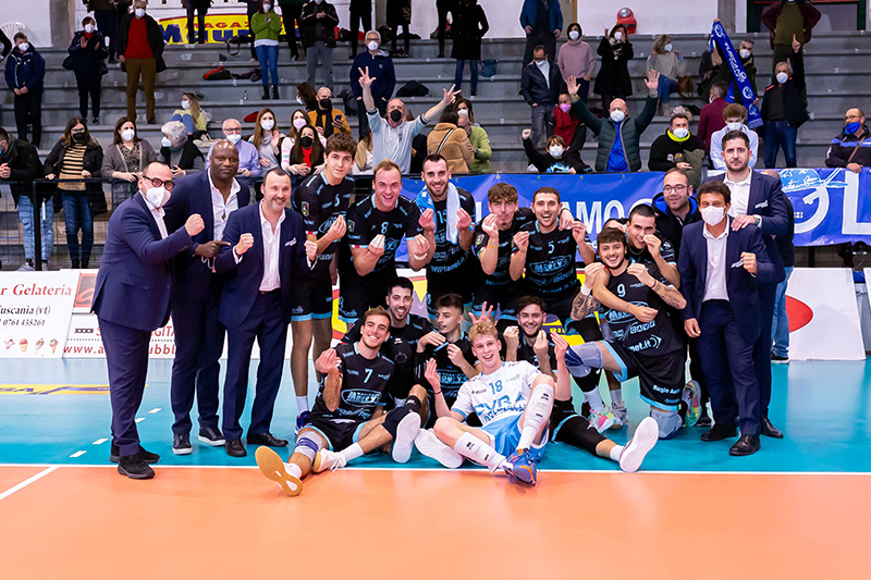 Terzo set: Kindgard si becca il rosso, punto e servizio a Tuscania 8/6. Muro a tre di Tuscania su Vinti, Lecce ferma il tempo 11/8. Si prosegue punto a punto con Tuscania sempre avanti 17/13. Nel Tuscania, Della Rosa per Ceccobello per il servizio. Azione prolungata chiuda da Rossatti con un mani fuori del muro, Lecce chiede il video-check che gli dà torto 20/17, Darraidou chiama il time-out 20/17. Primo tempo vincente di Menichetti 21/18. Nel Tuscania, entra Catinelli per lo stesso Menichetti. Ace di Kindgard, Passaro ferma il tempo 21/20. Attacco vincente di Boswinkel 24/22, primo match ball per Tuscania. Lo stesso opposto olandese mette a terra la palla del 25/22 che assegna i tre punti a Tuscania.