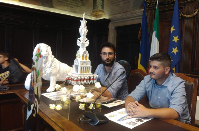 La mini macchina di quest’anno ha una storia particolare, che sembra un film. A raccontarla è Luca, 18 anni, appassionato di bozzetti e della macchina di Santa Rosa: “Da piccolo sono cresciuto in mezzo ai disegni e alle bozze di mio padre, Gianluca Di Prospero. Era il 2008, avevo solo 8 anni, e un giorno mi mise un pennello in mano e iniziammo a dipingere insieme il bozzetto. Lo presentammo e arrivò terzo. Quando 10 anni dopo Diego Terzoli ci ha proposto di realizzare la bozza per la mini macchina, mio padre ha rifiutato. Io invece mi sono buttato. Ho chiamato il mio amico Emanuele Derosas e ci siamo messi al lavoro”.