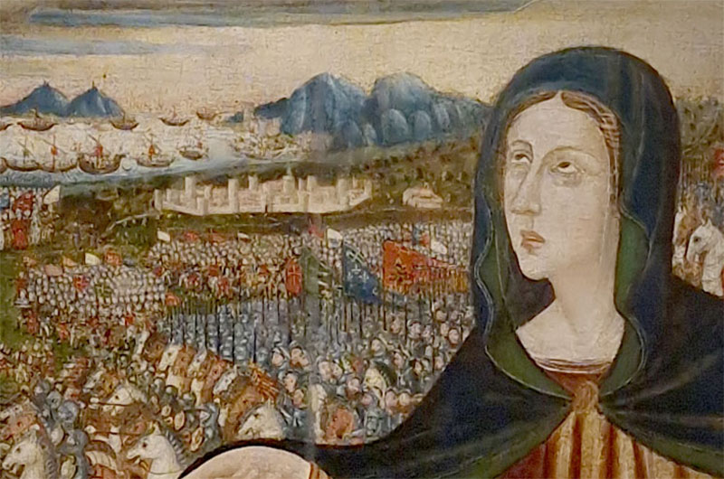 Proprio la veduta urbana restituisce all’opera un particolare rilievo storico, offrendo una rappresentazione preziosa della Viterbo del XVI secolo. La scena, a lungo interpretata in relazione alla Battaglia di Lepanto, è stata ricondotta dagli studi più recenti a un diverso episodio storico, coerente con la data visibile nel loggiato della Rocca raffigurata nel dipinto.