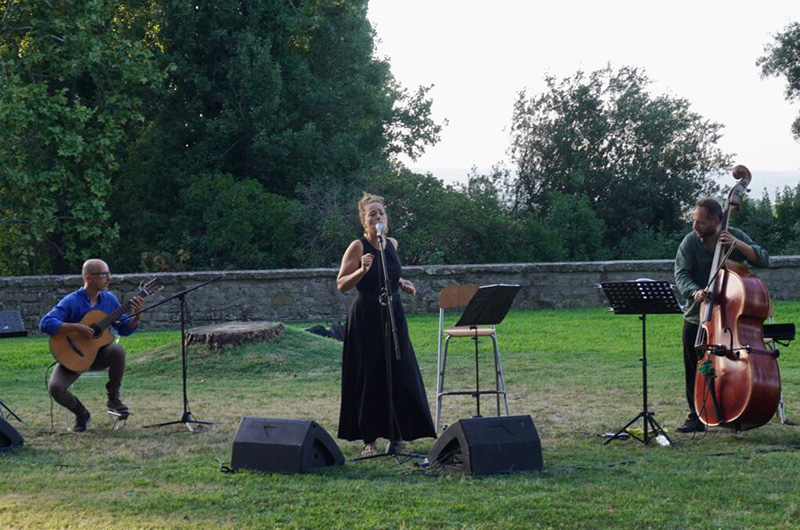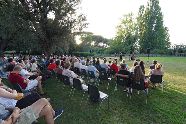 Ilaria Pilar Patassini in “TERRA SENZA TERRA” con Federico Ferrandina alla chitarra classica e Andrea Colella al contrabbasso in uno scenario magico hanno avvalorato la spettacolarita della lacation. Parliamo di Villa Lante, uno dei più famosi giardini italiani manieristici del XVI secolo. La performance  di Ilaria Pilar Patassini si è rivelato un manifesto poetico e musicale che dà voce allo sguardo poliedrico dell’artista. Peccato solo 200 posti a prenotazione, per un ingresso gratuito, speriamo in qualcosa di più a seguire. Certo è che un sito del genere va tutelato. La rassegna di teatro, musica e danza, curata da Tetraedro Compagnia Teatrale, in collaborazione con il Comune di Viterbo e la Direzione Regionale dei Musei del Lazio, è sostenuta economicamente da Ance Viterbo. Tutti gli appuntamenti a seguire 2-3-4 agosto sono sold out . Si va per il secondo evento questo venerdi 2 agosto: con Gegè Munari Quintet, appuntamento sempre alle ore 19.00 nel parco. (LucPas)
