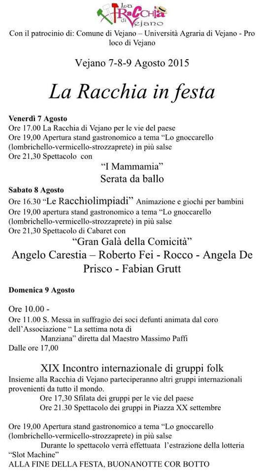 Gruppi folk da tutto il mondo si uniranno a Vejano per La Racchia in festa, manifestazione giunta alla XIX edizione in programma dal 7 al 9 agosto in piazza XX Settembre a Vejano.