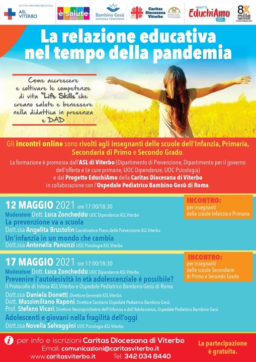 “La relazione educativa nel tempo della pandemia”. È il titolo del ciclo di due incontri formativi rivolti agli insegnanti degli istituti della Tuscia che si svolgeranno, in modalità webinar, il 12 e il 17 maggio.