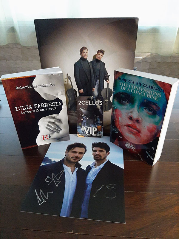 Dopo lo show è stata invitata dalla Vivo Concerti (società organizzatrice dell’evento) a raggiungere Luka Šulić e Stjepan HAUSER nel backstage per consegnare loro una copia (in lingua inglese) dei suoi ultimi due romanzi, “Le confessioni di una concubina” e “IULIA FARNESIA – Lettere da un’anima