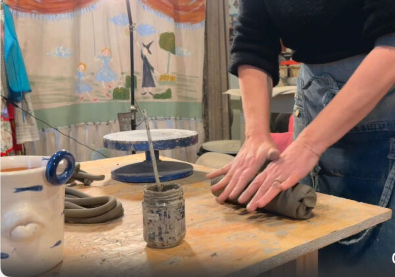 Romana, ma viterbese di adozione, Elena Urbani è un’artista a tutto tondo, una di quelle che non tiene la propria arte per sé, ma prova piacere a condividerla: i suoi laboratori di ceramica sono seguitissimi. «Attualmente da una settantina di iscritti, e parliamo solo degli adulti. Durante i laboratori la gente sta proprio bene… Io vivo del loro benessere». Il laboratorio si trova al piano superiore: uno spazio allegro e vissuto, pronto per accogliere i corsisti per ogni nuova esperienza artistica e di socializzazione. Sulle pareti scaffali pieni di prodotti realizzati da loro, che andranno cotti nei forni e poi smaltati. «Lavoro molto con i corsi e con la didattica per le scuole», prosegue Elena. «Rispetto alla ceramica tradizionale viterbese, che poi è un tipo di decorazione, io faccio più propriamente scultura: i miei allievi fanno manipolazione dell’argilla e creazione degli oggetti. Ogni corsista ha la possibilità di realizzare un proprio prodotto: vengono con un’idea, la sviluppiamo insieme. Sono tanti anni che faccio questa attività, e imparo sempre moltissimo da loro». In occasione del Giubileo di quest’anno, Elena ha ideato un laboratorio dedicato, con un tema che si ricollega alla sua storia più antica e gloriosa. «Abbiamo immaginato questa chiave-simbolo, che potesse rappresentare Viterbo in occasione del Giubileo, richiamando il concetto del primo conclave, cum clave: con l’impugnatura che richiama l’idea dell’arcata del Palazzo Papale. Ma dai colori pop, forti, per dare il concetto di innovazione della tradizione. Pensiamo di fare laboratori smart a tema, in cui si creerà una chiave, ma si porterà via in omaggio una chiave più piccola già creata e pronta. Un simbolo del proprio passaggio a Viterbo».