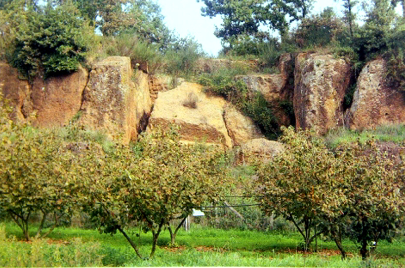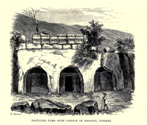 La Tomba del Peccato di Falerii Novi, ubicata nel settore della necropoli di Tre Camini dislocato lungo la via di Terrano e nota sin dal XIX secolo, è inquadrabile tra le tombe a portico del tipo di Fàlleri così denominato da Giovanni Colonna. Com’è noto, il monumento ha subìto danni molto ingenti. A seguito del rovinoso crollo del vestibolo della tomba (fig. 2a-b-c), dovuto alle piogge alluvionali del 1991, la Soprintendenza Archeologica per l’Etruria Meridionale ha condotto alcune campagne di scavo, seguite sul campo da Maria Gilda Benedettini, che hanno consentito di acquisire nuovi dati utili alla comprensione dell’originaria struttura del monumento. Tra di essi va menzionato il ritrovamento di due sculture in peperino, un leone a tutto tondo ed una protome di Medusa del tipo « bello »scolpita sul lato breve di un blocco rettangolare. Alla luce di nuovi documenti inediti, disegni realizzati nel XIX secolo da architetti francesi, pensionnaires dell’Académie de France a Roma, saranno esposte alcune riflessioni sulla originaria struttura e decorazione del sepolcro.