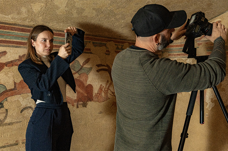 Il progetto è stato ulteriormente valorizzato da un ampio repertorio di immagini e video di backstage, documentando le fasi di smontaggio della tomba a Tarquinia, il trasferimento verso Milano e l’installazione nelle sale della Fondazione Rovati, testimonianza della complessità di uno dei prestiti più importanti mai concessi dal PACT.