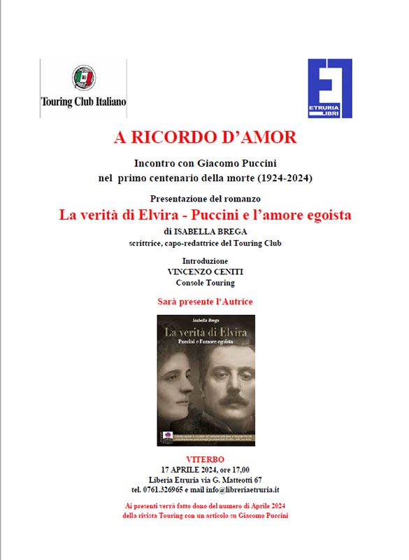 Il gruppo consolare di Viterbo del Touring Club ricorda Giacomo Puccini, nel centenario della morte (1924-2024), mercoledì 17 aprile 2024 alle ore 17,00 presso la Libreria Etruria di Viterbo (via Matteotti 67)  verrà presentato il romanzo “La verità di Elvira – Puccini e l’amore egoista” (Albeggi Edizioni) della collana “Infiniti modi di viaggiare”di Isabella Brega scrittrice e caporedattore del Touring Club Italiano.
