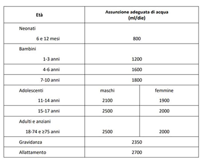 La tabella qui sotto indica appunto le quantità di Acqua in millilitri (mL), per fasce d’età, sesso e per situazioni quali gravidanza e allattamento.