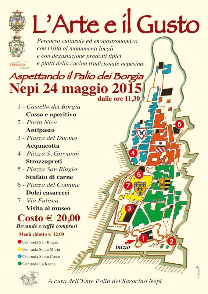 7 tappe culturali ed enogastronomiche per scoprire le bellezze della città, i monumenti che hanno segnato la storia di Nepi dal V secolo a.c. fino al XVIII secolo e gustare antichi piatti tradizionali della cucina locale con tutti i prodotti tipici del posto. Ad ogni partecipante sarà fornita all’ingresso una miniguida che consentirà di conoscere la storia dei monumenti interessati dal percorso e ad ogni tappa prevista potrà gustare un piatto tipico, cucinato dai cuochi delle quattro Contrade del Palio dei Borgia, che farà riscoprire gli antichi sapori della cucina nepesina.