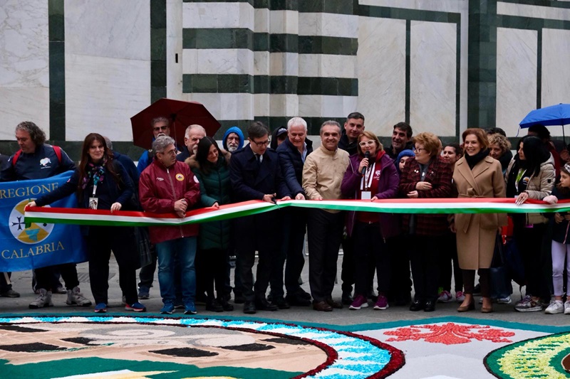 L’Associazione infioratori Bolsena tra gli autori del tappeto monumentale di 144 metri quadrati, realizzato con 84 colori e 18 materiali diversi, che ha abbellito il 26 e 27 aprile piazza del Duomo a Firenze per il Festival arti effimere Unesco edition 2024. Il quadro, dal titolo “Le meraviglie dell’Unesco italiano in un sogno tutto effimero”, ha reso omaggio ai monumenti italiani riconosciuti Patrimonio dell’Umanità e celebrato l’ufficialità della candidatura dell’“L’arte di creare tappeti di fiori e altri materiali naturali” a Patrimonio immateriale dell’Umanità dall’Unesco. “Abbiamo vissuto un’esperienza unica – sottolinea l’assessore comunale al turismo religioso Roberto Basili -. Ci siamo incontrati e confrontati con le più importanti associazioni italiane che organizzano le infiorate, accogliendo suggerimenti e prendendo spunto da riproporre nella nostra infiorata che si svolgerà il prossimo 2 giugno. Nello specifico, il nostro gruppo, insieme a quelli Genzano, Gerano, Noto, Montefiore dell’Aso e Taurianova, si è occupato della pulitura e della posa dei fiori”. Alla creazione del tappeto hanno lavorato per 10 ore più di 150 persone, provenienti da 14 associazioni provenienti da Sicilia, Calabria, Abruzzo, Lazio, Marche, Toscana e Sardegna e hanno collaborato anche infioratori di tappeti di Malta e della Catalogna. Se si aggiungono le 80 ore necessarie per eseguire la progettazione e la preparazione preventiva dei materiali, l’opera è il risultato di quasi 100 ore di creatività, lavoro di squadra, solidarietà ed eccellenza artistica.