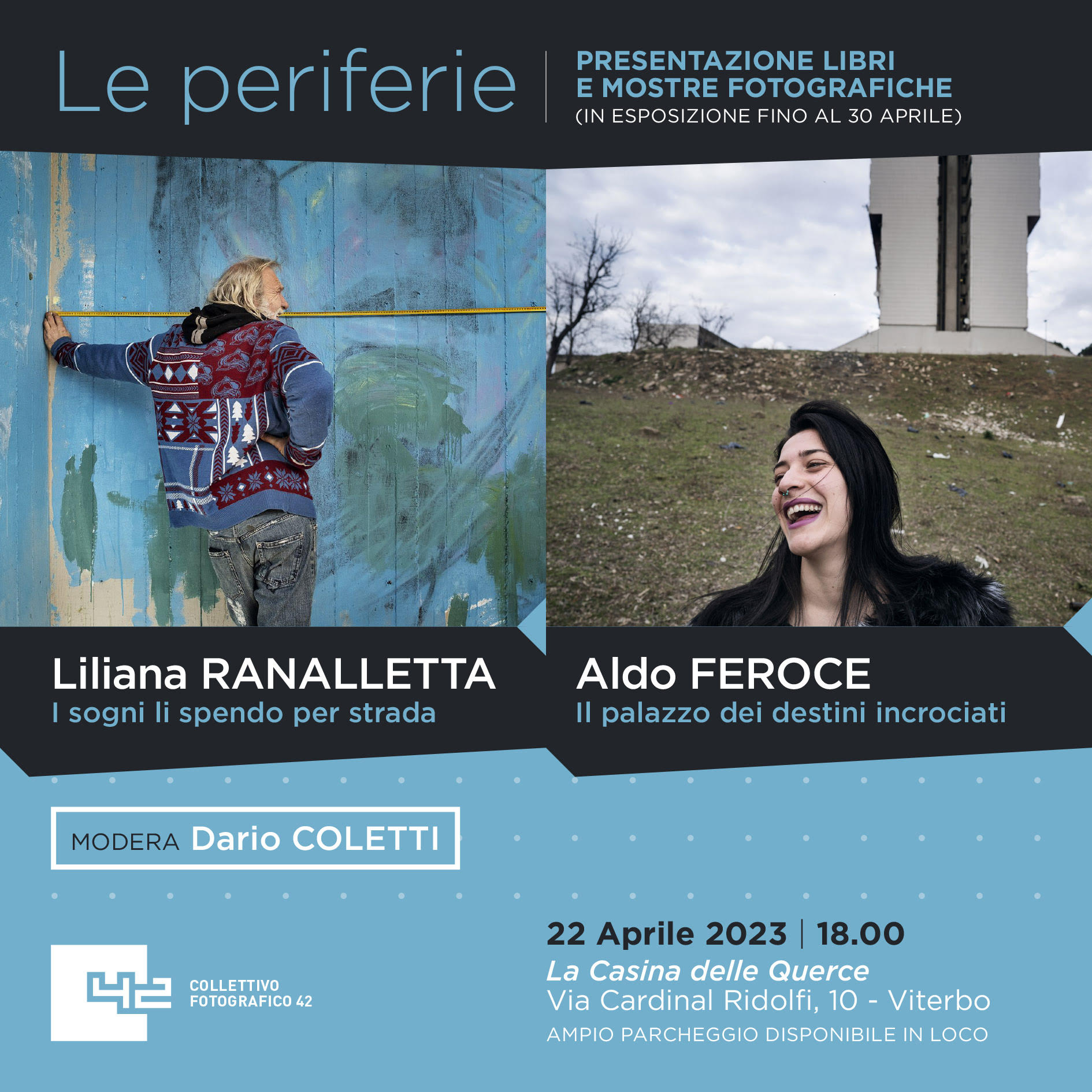 A inaugurare questa serie di incontri saranno, sabato 22 aprile, alle ore 18.00, i fotografi romani Liliana Ranalletta e Aldo Feroce che presenteranno i loro libri “I sogni li spendo per strada” e “Il Palazzo dei destini incrociati”. Gli autori, con la moderazione di Dario Coletti, accompagneranno il pubblico presente in un viaggio alla scoperta delle periferie, luoghi spesso associati a degrado e malavita, ma che in realtà nascondono mille storie di vita vera e umanità che gli autori raccontano attraverso il loro lavoro.