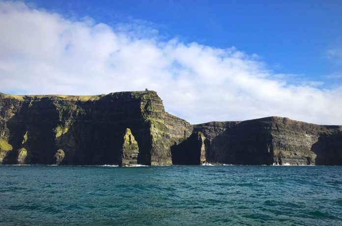 Seeing the Cliffs of Moher from the top and gazing down to where their rocky bases meet the ocean wasn’t the only part of the adventure; following our exploration of the trails along the peaks of the cliffs we traveled down to a small port and were lucky enough to then embark on a boat tour of the cliffs. It was phenomenal—unless you get sea sick, in which case I would suggest keeping your own two feet on land and far away from the rocking boat and turbulent water. The boat ride is riveting though, it takes you along the coastline and the sun came out just in time for us to observe the cliffs basking in the sunlight as we sailed by. Tiny people, the size of the seagulls that flutter about the cliffs, dot the tops of the cliffs, doing exactly what we had been doing only an hour ago. To view the cliffs from below though, is an entirely different venture. It’s even more breathtaking than seeing them from the top, in my opinion, but I love the ocean so perhaps I’m a tad bit biased. But you ought to see the ocean that crashes against the Cliffs of Moher, it’s not like any other ocean you’ve seen I’ll bet. This mesmerizing deep blue-green shade draws you in—it’s the kind of water you’d expect to see mermaids in. With the enchanting Cliffs of Moher looming above, I wouldn’t be surprised to find something equally as magical, lurking somewhere below.