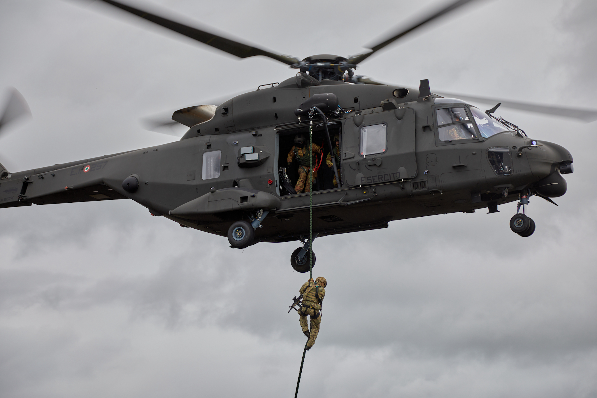 Al termine della cerimonia, alcuni elicotteri UH-90 e CH-47F dell’Esercito hanno svolto un atto tattico addestrativo operando, fra l’altro, il recupero di personale con la tecnica del FRIES (Fast Rope Insertion Extraction System).