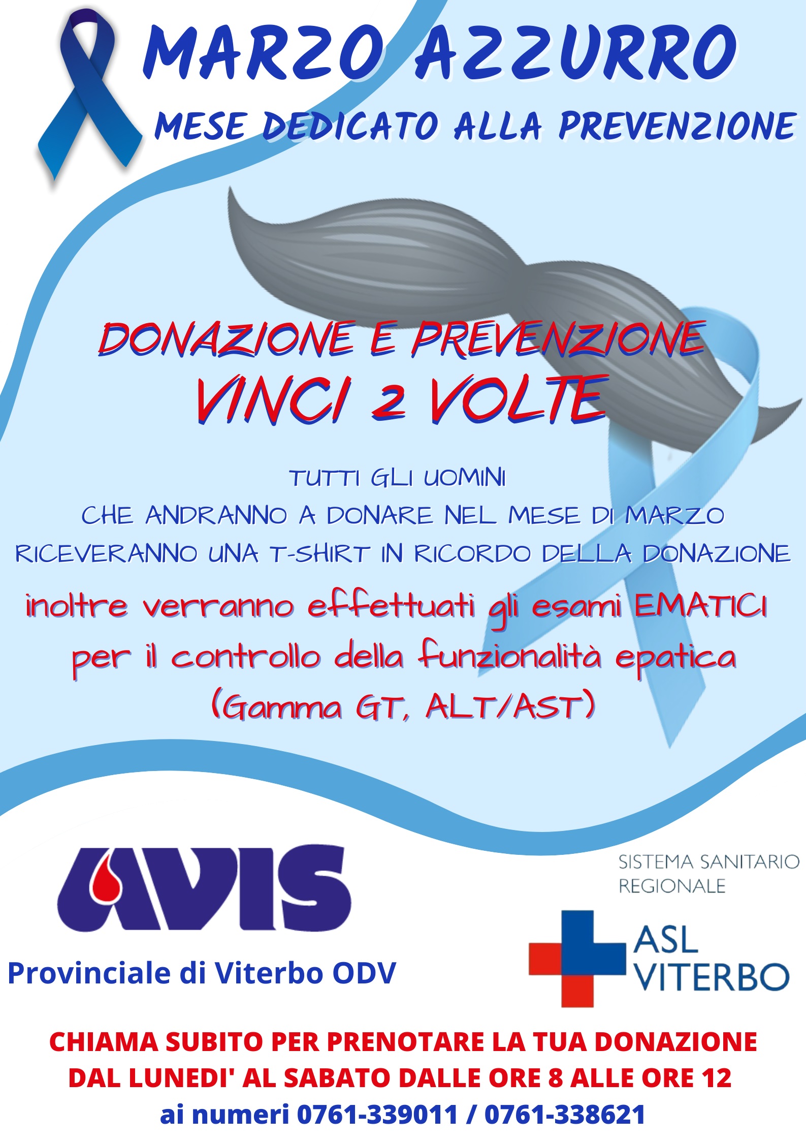 Il mese di marzo è dedicato alla prevenzione della salute dell’uomo “Marzo Azzurro” che vedrà coinvolte tutte le Avis della Provincia di Viterbo.