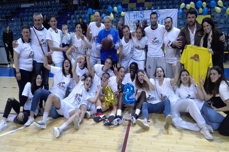 I minuti passano e la festa si avvicina perché Ancona, nonostante l’impegno, non ce la fa a staccare le Ants: a referto si iscrive anche Yordanova e il gioco da tre punti di Spirito porta di nuovo il quintetto di casa sul +4 (52-48). Gli ultimi minuti sono un lungo conto alla rovescia per la festa, vanno in campo anche le più giovani come Camilla Ricci che si fa notare per il grande impegno e Giulia Quaresima, autrice di un bel canestro. L’ultimo tiro libero di Nociaro serve solo per le statistiche e precede il tripudio del foltissimo pubblico gialloblù che può salutare il ritorno delle Ants nel secondo campionato nazionale.