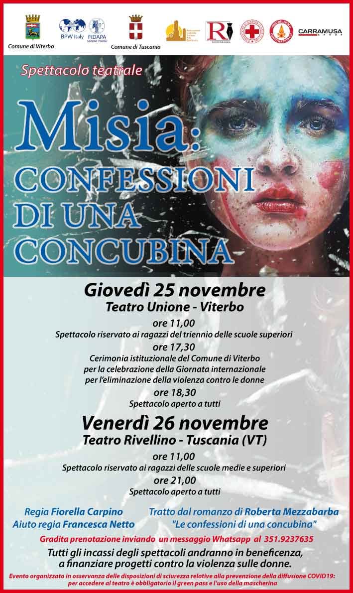 Il Comune di Viterbo addirittura ha voluto fare sua questa rappresentazione teatrale, ed ha spostato il consueto appuntamento per la celebrazione della Giornata internazionale per l’eliminazione della violenza contro le donne dalla sala Regia di Palazzo dei Priori al Teatro dell’Unione, come preludio allo spettacolo. Di questo ringrazio il sindaco Giovanni Arena L’assessore allo spettacolo Marco De Carolis e l’assessore alle politiche sociali Antonella Sberna.