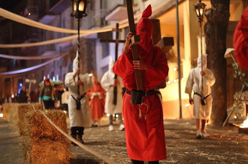 venerdì Santo.Solenne Processione con trasporto della bara del Cristo morto, della statua di Maria, accompagnata da uomini incappucciati detti ‘Ntencheli (Cirenei) che trasportano croci, lampioni, catene. La processione come tutti gli anni si svolgerà per le vie del paese, opportunamente abbellito con migliaia di luci naturali e fiaccole per ricreare la suggestione di un evento unico.