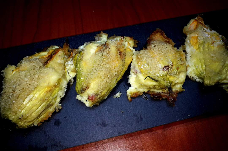 FIORI DI ZUCCA RIPIENI : per 5 fiori di zucca serviranno 80 g di ricotta di bufala, 60 g di speck tagliato a listarelle, 2 cucchiai di parmigiano grattugiato, un uovo , pangrattato, olio . In una ciotola amalgamate la ricotta con l’ uovo, il parmigiano grattugiato e lo speck. Pulite i fiori di zucca cercando di non romperli. Riempite ognuno con il composto. Disponete su una teglia, cospargete con il pangrattato e un filo di olio. Infornate a 180° per 25 minuti. Servite caldi o tiepidi.