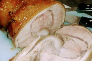 PORCHETTA DI VITELLO: una pancetta di vitello, una cotenna di maiale, finocchietto selvatico, 3 salsicce, 3 spicchi di aglio, olio, sale e pepe. Stendete la cotenna del maiale, sopra  la pancetta di vitello, mettete le salsicce prive di pelle , il finocchietto selvatico, due spicchi di aglio ridotti a crema, un pizzico di sale , spalmate il tutto all’interno della pancetta, arrotolate e legate con lo spago , disponetela su di una teglia da forno, versate un po’ di olio, copritela con la carta stagnola per non farla bruciare e infornate a 180° per circa 2 ore e mezza. Fatela freddare 10 minuti, tagliatela a fette e servitela.
