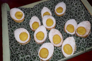 BISCOTTI UOVO ; per la pasta frolla 220 g  farina 0, 120 g di maizena, 2 uova , 50 g di olio extravergine d’oliva,  un cucchiaino di lievito per dolci, il succo di mezzo limone , per la crema 200 ml di latte, 2 tuorli, un cucchiaio di maizena,  2 cucchiai di zucchero a velo, il succo di mezzo limone.  Preparate la pasta frolla impastando la farina con la maizena,  le uova, l’ olio , il succo del limone e  il lievito .quando l’impasto risulterà liscio e omogeneo mettetelo da parte coprendolo con la pellicola. Nel frattempo scaldate il latte , in una ciotola mescolate i tuorli con la maizena,  lo zucchero e   il succo del limone , versatelo poi nel latte caldo e mescolate fino a che il composto non sarà diventato denso. Versatelo in una ciotola,  coprite con della pellicola e fate freddare. Stendete la pasta frolla,  o a mano o con una formina dategli ad ognuno la forma di ” uovo” ritagliatene 16 , poi altre 16 e a quest’ ultime fate con una formina più piccola a cerchio, un foro nella parte bassa. Fate cuocere a 180° ( forno preriscaldato e ventilato) per circa 15 minuti.  Fate freddare. Ora create i biscotti mettendo un cucchiaio di crema sulla base senza il foro, poi adagiateci sopra la parte con il  buco , cospargete con lo zucchero a velo.
