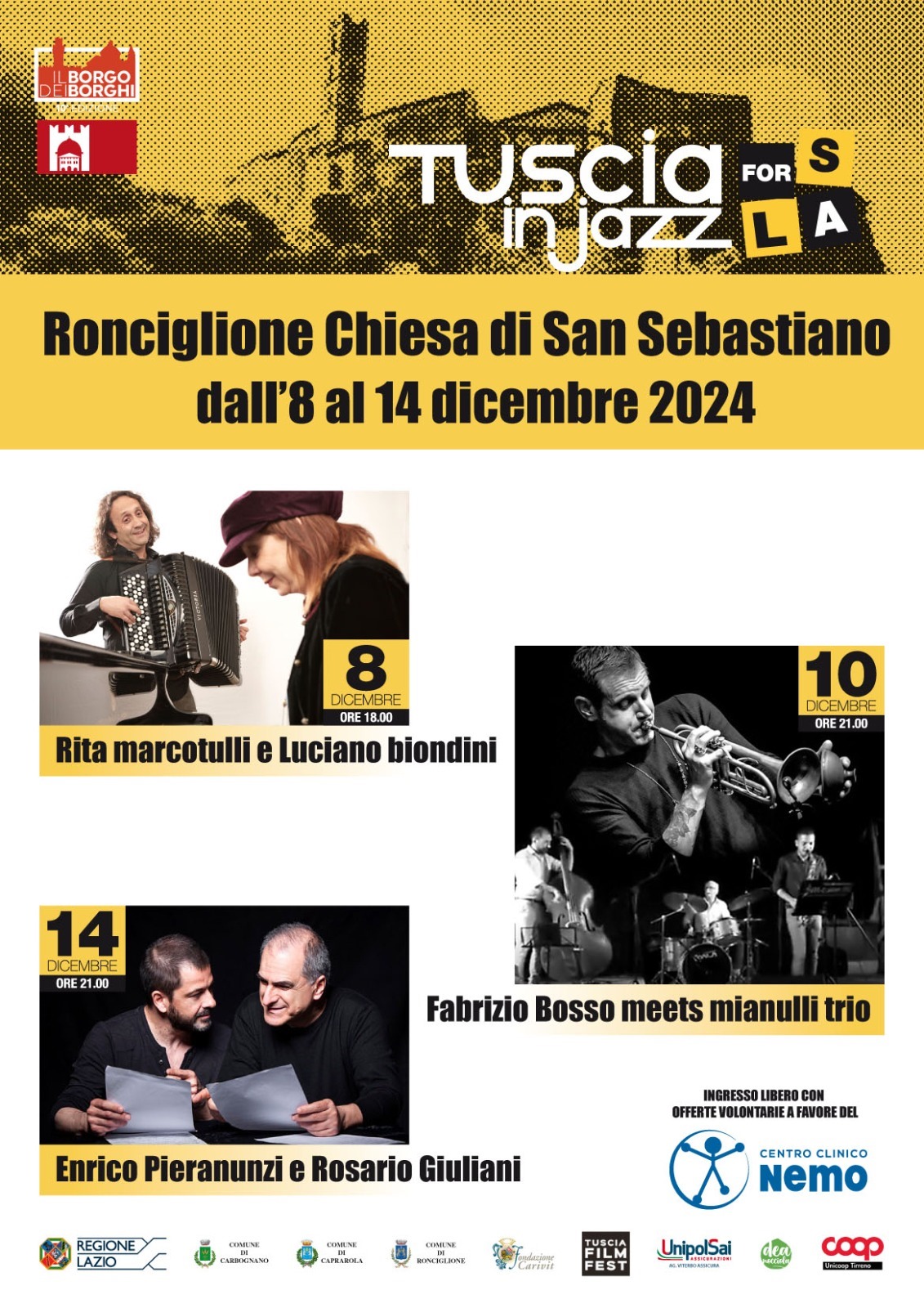 Tuscia in Jazz for SLA 2024 regala a Ronciglione tre grandi appuntamenti con la musica jazz all’insegna della ricerca contro la SLA. I concerti si terranno presso la Chiesa di San Sebastiano in Piazza Vittorio Emanuele (ingresso libero con offerte volontarie al Centro Clinico Nemo del Policlinico Gemelli di Roma).