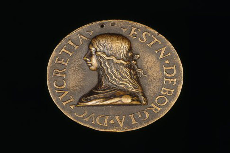 In foto: ANONIMO ARTISTA MANTOVANO ( legato a GIAN CRISTOFORO ROMANO) Lucrezia Borgia, moglie di Alfonso d’Este , 1502. Bronzo. Washington, National Gallery of Art.