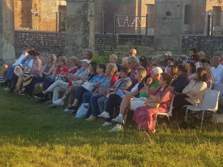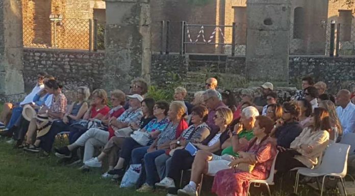 Mai poesia e attualità, seppure di mezzo secolo addietro, sono andate tanto d’accordo. A cinquanta anni dalla discesa dell’uomo sul nostro satellite, domenica 21 luglio Ferento riesce a mettere insieme lirica e ricordi in uno di quei “Tramonti” che soltanto questo luogo magico può dare. Il “Concerto per Leopardi” diventa un “Omaggio alla luna”. A realizzarlo attraverso le poesie meno conosciute del poeta di Recanati, le letture di Giuseppe Rescifina e Simonetta Pacini, le vibrazioni musicali e la voce di Giancarlo Necciari, le coreografie di Alessandra Ragonesi. Atmosfera magica con una leggera brezza che accarezza il numeroso pubblico, un tramonto che allunga dolcemente sull’orizzonte i suoi batuffoli rosa, perfino il dolce profumo che inonda l’aria di mentuccia. Il resto è musica, appunto: quella che arriva dai versi di Leopardi e dalla chitarra del maestro Necciari. E’ una serata magica. Con una sorpresa, quella della presenza di Raffaello Orlando, figlio del mitico Ruggero che consacrò alla storia lo sbarco sulla luna, il 21 luglio del 1969. La chiacchierata del giornalista Rescifina con Raffaello diventa un simpatico amarcord, punteggiato di aneddoti inediti per il grande pubblico, quello soprattutto che vedeva ancora la tivù in bianco e nero e considerava Ruggero quasi un amico di famiglia, dal quale ogni sera ascoltare le notizie che arrivavano da “Nova York”, come puntualizzava con vezzo italico il corrispondente. Leopardi tornerà ancora domenica prossima,il 28 luglio sempre alle 19,30, a Ferento per un nuovo imperdibile incontro. Un incontro “Infinito”.