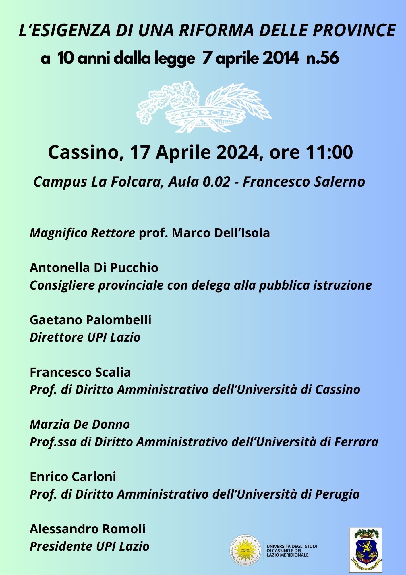 “L’esigenza di una riforma delle Province”, a Cassino covegno a 10 anni dalla legge 7 aprile 2014 n. 56