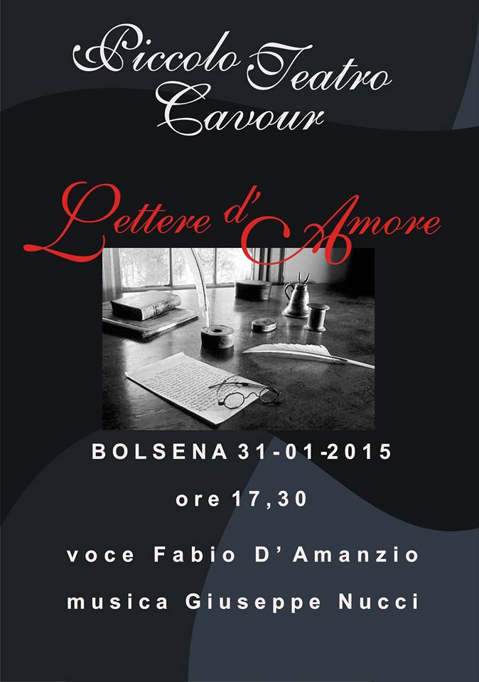 Lettere d’amore” è il titolo dell’incontro dedicato alla poesia che si terrà sabato 31 gennaio alle 17.30 presso il Piccolo Teatro Cavour di Bolsena. Con la voce di Fabio D’Amanzio e la musica di Giuseppe Nucci si ripercorreranno le storie d’amore dei grandi personaggi del passato.