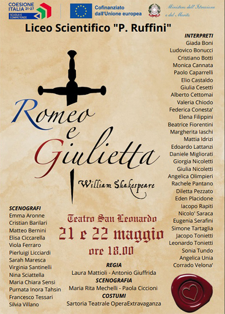 Tanta passione sicuramente, quella che ha ispirato il lavoro di 44 studenti del Liceo Scientifico “Paolo Ruffini”, tra attori e scenografi, guidati dalla regia dei professori Laura Mattioli e Antonio Giuffrida, e dalle professoresse Maria Rita Mechelli e Paola Ciccioni alla scenografia. Si ripete l’appuntamento, alla sua terza edizione, atto finale del progetto di laboratorio teatrale e scenografia inziato a ottobre scorso e finanziato quest’anno con i fondi del PNRR, progetto fortemente voluto e sostenuto dalla D.S. Prof.ssa Claudia Prosperoni. A impreziosire ulteriormente l’edizione di quest’anno, il contributo della sartoria teatrale “Opera Extravaganza”, che ha collaborato con gli studenti nella realizzazione dei costumi di scena, dando vita a una veste visiva curata. I ragazzi partecipano con grande entusiasmo e negli anni passati hanno saputo regalare gradevolissimi momenti di bravura e divertimento, quando sono andate in scena nel 2023 una rivisitazione in chiave comica de “I promessi sposi” e nel 2024 un’altra libera interpretazione del teatro shakespeariano con “Sogno di una notte di mezza estate”.