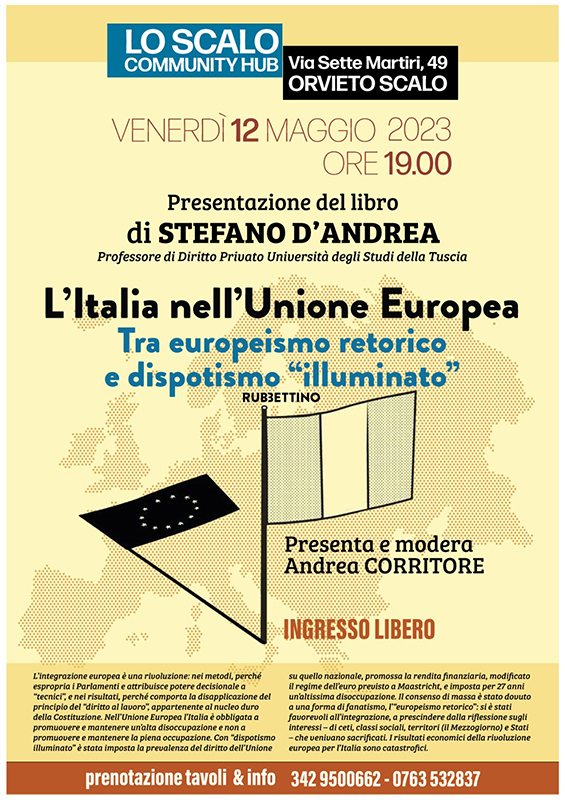 Venerdi 12 maggio dalle ore 19 il Community Hub “Lo Sc@lo” (ad Orvieto, in Via Sette Martiri 49) ospiterà Stefano D’Andrea, professore di Diritto privato presso l’Università degli Studi della Tuscia, che presenterà il suo nuovo libro: L’Italia nell’Unione Europea: tra europeismo retorico e dispotismo “illuminato”, da poco uscito per i tipi di Rubbettino. Analizzando con profondo rigore le procedure, i dispositivi e le conseguenze che hanno accompagnato tutte le fasi dell’integrazione europea, D’Andrea mette insieme un contributo fondamentale per avviare un ampio approfondimento critico su ciò che questa ha rappresentato per il nostro paese sin dagli anni Cinquanta, con una particolare attenzione alle dinamiche politiche e decisionali di tali eventi, che hanno rivoluzionato l’assetto istituzionale, economico e sociale italiano in maniera talmente profonda da lasciare stupefatti gli stessi europeisti radicali. Sarà un’occasione importante per riflettere sugli ultimi trent’anni di storia e per provare ad ipotizzare quali prospettive future si possono aprire anche a seguito del continuo, spesso drammatico e sempre tumultuoso, mutamento della situazione internazionale. Presenterà il libro e modererà il dibattito Andrea Corritore.