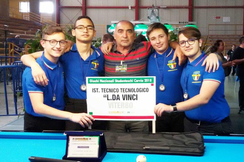 Non partiva certamente con i favori del pronostico la compagine viterbese del Leonardo da Vinci di Viterbo, che per il terzo anno consecutivo ha partecipato rappresentando il Lazio, ai Campionati Italiani Studenteschi di Biliardo specialità Stecca che ha raccolto a Cervia i migliori giocatori delle scuole di dodici regioni, ma una perfetta condotta di gara dei suoi 4 giocatori, gli ha consentito la conquista dell’ambito argento, superata soltanto in finale dal qualificatissimo Liceo Menotti di Cantù (CO).