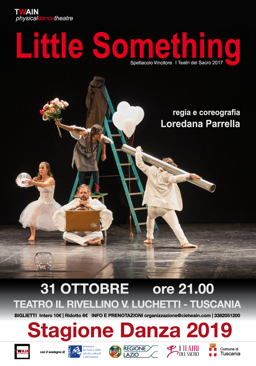 Il 31 ottobre, la Stagione Danza per la prima stagionale inaugura il Teatro Il Rivellino – V.Lucchetti di Tuscania (VT), dove Twain presenterà la propria produzione Little Something, spettacolo vincitore de I Teatri del Sacro 2017, regia e coreografia di Loredana Parrella con Yoris Petrillo, Elisa Melis, Luca Zanni, Maeva Curco Llovera, Enea Tomei e la drammaturgia di Beatrice Balla. Il testo di François Garagnon, in una lingua metaforica e personale, racconta il viaggio della costruzione di sé, contrapponendo la filosofia dell’essere alla filosofia dell’avere: l’obiettivo dell’esistenza è divenire, essere un Grande Amore Senza Fine, anche se in partenza siamo una piccola cosa, un Little something appunto.