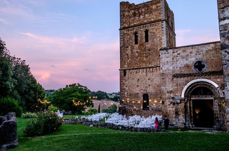 A chiudere il cerchio è una proposta che sconfina nella provincia romana ma che per la sua bellezza densa di storia fa gola anche agli sposini della Tuscia. I primi a vivere nell’Abbazia di Sant’Andrea in Flumine furono, con certezza, i monaci benedettini nell’VIII secolo ma da alcuni ritrovamenti pare che la struttura fosse già nota in epoca romana. Oltre al giardino e alle ampie sale affrescate con più di 200 posti, la vera chicca del complesso è la chiesa in stile romanico con i suoi stupendi mosaici cosmateschi e dove oggi è possibile celebrare il rito religioso.