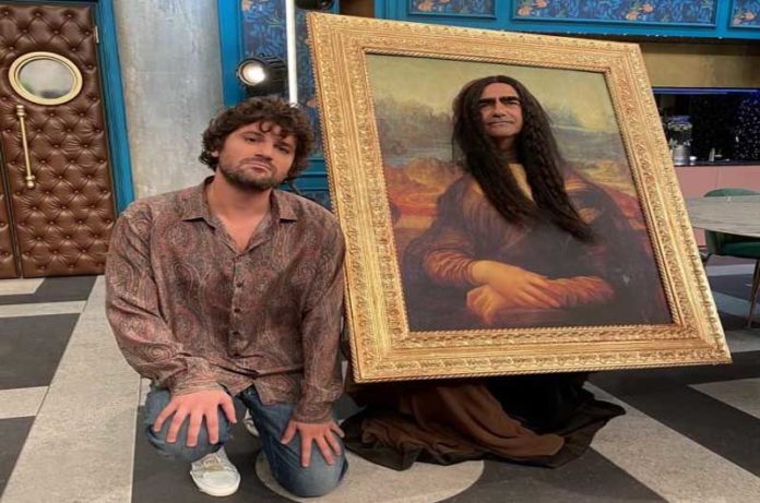 Nella foto: Elio, vestito da Gioconda (a destra), l’opera d’arte più indecifrabile che ci sia.