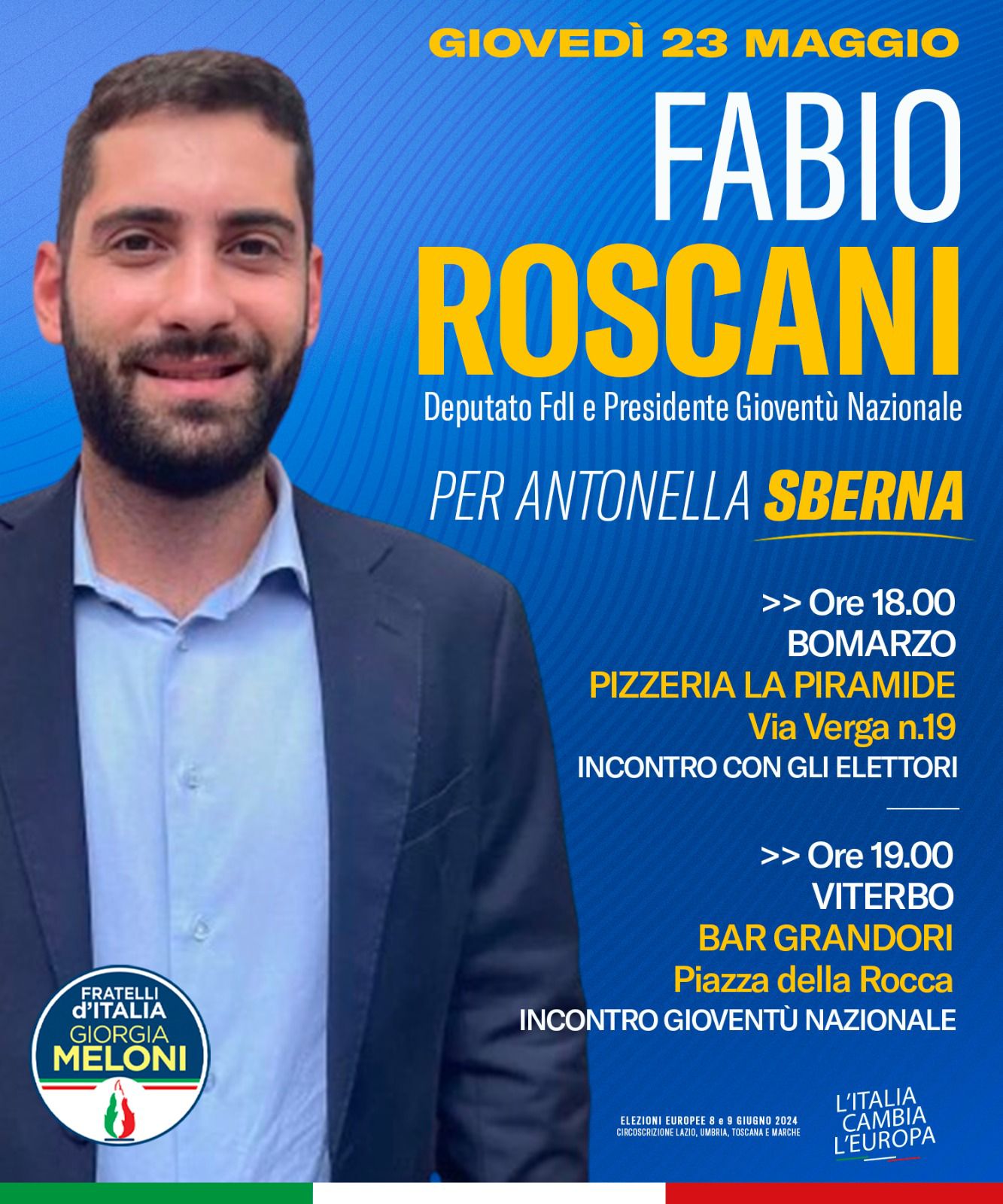 L’onorevole Fabio Roscani, deputato di Fratelli d’Italia e presidente di Gioventù Nazionale, sarà presente, giovedì 23 maggio, a Bomarzo e a Viterbo per due incontri a sostegno della candidata Antonella Sberna in vista delle prossime elezioni europee dell’8 e 9 giugno.
