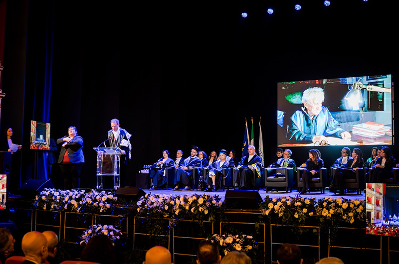 Don Antonio Mazzi, impossibilitato a partecipare di persona, è intervenuto in collegamento video da Milano. “Accetto con gratitudine questa laurea perché credo profondamente nel valore della parola. Oggi, più che mai, la parola è stata inquinata e abusata, soprattutto nell’ambito digitale, perdendo il suo potere di costruzione, educazione e cambiamento. Dobbiamo riscoprirne il senso autentico, restituirle dignità e imparare a distinguere tra rumore e significato. La comunicazione – ha concluso – deve unire, non dividere. La parola autentica trasforma e costruisce legami. È nostro compito, oggi, riscoprire il valore del silenzio e della parola vera, per restituire alla società uno strumento di dialogo e crescita. Senza la parola, saremmo fiamma fuori dal fuoco e acqua fuori dal mare.”