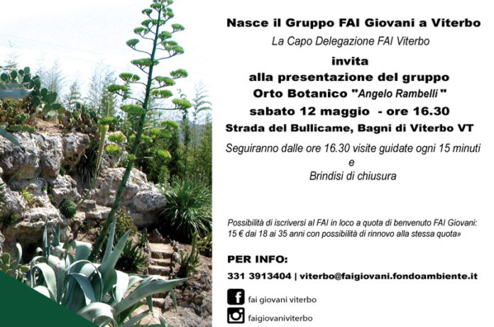 Sabato 12 maggio alle 16,30 l’Orto Botanico “Angelo Rambelli” dell’Università della Tuscia ospiterà la presentazione del GRUPPO FAI GIOVANI a VITERBO. “FAI fiorire la Cultura” questo il titolo dell’evento che prevede tra l’altro una visita guidata alla scoperta di tutte le specie botaniche che questo magnifico luogo racchiude e protegge. Le visite guidate saranno possibili a partire dalle ore 16.30 (partenza dei gruppi ogni 15 minuti), seguirà alle ore 18 il saluto introduttivo del capo delegazione di Tarquinia-Viterbo, Lorella Maneschi. In chiusura è previsto un brindisi con accompagnamento musicale. Ci sarà anche la possibilità di iscriversi al FAI durante l’evento. L’iniziativa della costituzione del GRUPPO FAI GIOVANI a VITERBO è nata grazie a un gruppo di studenti provenienti da vari dipartimenti dell’Università degli Studi della Tuscia. Come hanno sottolineato gli stessi ragazzi lo scopo è riscoprire e valorizzare le bellezze storico-artistiche e paesaggistiche della Tuscia, tramite l’organizzazione di eventi culturali realizzati anche con la collaborazione di musei ed istituzioni culturali locali. La manifestazione terminerà alle 19.
