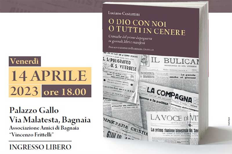 Per Luciano Costantini bambino la narrazione della storia è iniziata con il nonno Romoletto, lo dichiara nella prefazione del suo ultimo libro“O Dio con noi, o tutti in cenere”: “Probabilmente l’amore per la storia è nel mio Dna, certo la passione è emersa fin da bambino, ancor prima che andassi ad occupare un banco di scuola. È stato mio nonno, con i suoi piccoli e grandi racconti che venivano trasformate in fiabe di altri tempi. Poi il trascorrere degli anni – ricorda ancora Costantini – e la consultazione dei libri hanno giustamente fatto riguadagnare spazi alla oggettività storica senza per questo far scemare il piacere della indagine e della scoperta”. Un grande estimatore di Cesare Pinzi, da cui ha tratto buona parte degli spunti storici che lo hanno portato a scrivere i primi due libri. “Ho provato a ripercorrere quegli anni attraverso tre lavori: il primo “Il giorno che accecai il Duce”; il secondo “Fuori le donne da palazzo dei Priori”; editati con Settecittà, fino ad arrivare all’oggi con il terzo libro: “O Dio con noi, o tutti in cenere”. Una sorta di trilogia in cui con l’ultima sua creatura Costantini ha voluto, da giornalista rodato, comprendere il rimbalzo mediatico su aneddoti, situazioni e personaggi che hanno mosso e sono stati protagonisti del primo dopoguerra nella Tuscia, per offrire anche alla stessa comunità locale un contributo alla lettura dell’esistenza più recente di Viterbo e del suo territorio nell’evoluzione sociale, economica, politica, di costume. Un lavoro certosino per il cui fine il Costantini giornalista ha consultato i fogli che l’Archivio di Stato di Viterbo gli ha messo a disposizione, esaminando le decine e decine di delibere che l’amministrazione comunale del capoluogo aveva all’epoca varato. “Sono andato a spulciare i giornali, i manifesti, i fogli pubblici e privati, i libri di scrittori più o meno bravi e improvvisati, che possono dare un’idea verosimile del sistema della comunicazione di massa e, dunque, rendere testimonianza del clima, delle esigenze, delle situazioni, dei sentimenti, che animarono i primissimi tempi dopo la fine della seconda guerra mondiale. Dopo un anno di lavoro ne è uscita quella che ritengo essere la mia terza creatura”.