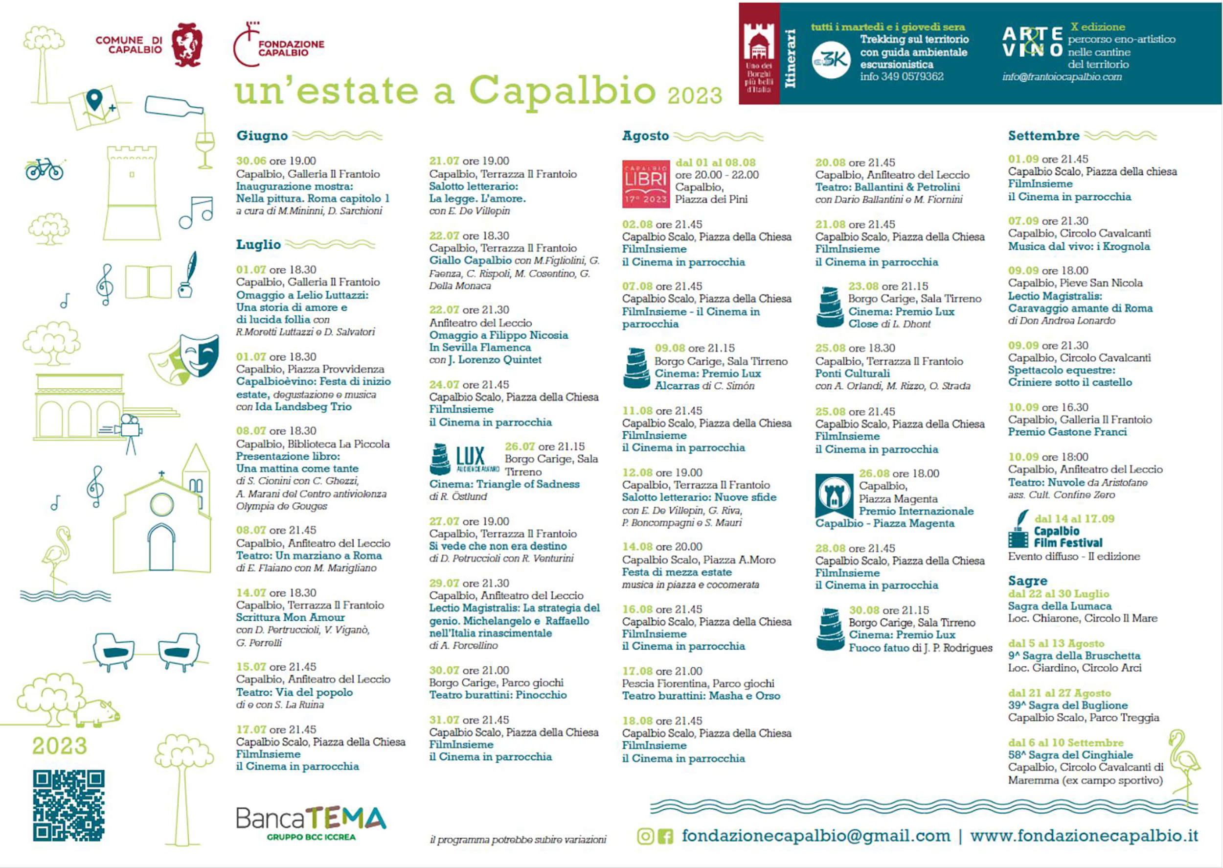 Un programma messo a punto dalla Fondazione Capalbio con il patrocinio del Comune ricco di appuntamenti che si sviluppano sui mesi di luglio e agosto con eventi di spessore, utili a trovare il gradimento di giovani, adulti, famiglie, divisi tra l’omaggio a Filippo Nicosia con lo spettacolo di flamenco, presentazione di libri con l’evento di punta Capalbio libri dal 1° all’8 agosto, in piazza dei Pini – Terrazza Capalbio Libri. Poi le sagre: della lumaca, della bruschetta, del buglione. Ma non finisce qui perchè anche settembre è ricco di sorprese tenete d’occhio il programma. La Maremma è vicina… L’ingresso è libero.