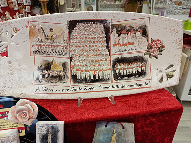 Ancora nei pressi del percorso, in via San Lorenzo 45, c’è Creazioni Daniela di Daniela Lombardo. Qui le creazioni in ceramica a tema Santa Rosa sono ormai da anni un marchio di fabbrica, con ogni genere di prodotto. Ma anche in via San Pellegrino 8 la Bottega d’arte di Daniela Lai ogni anno pensa a una novità per rendere omaggio alla Santa bambina. Stavolta ha plasmato piatti, croci e acquasantiere con le rose.