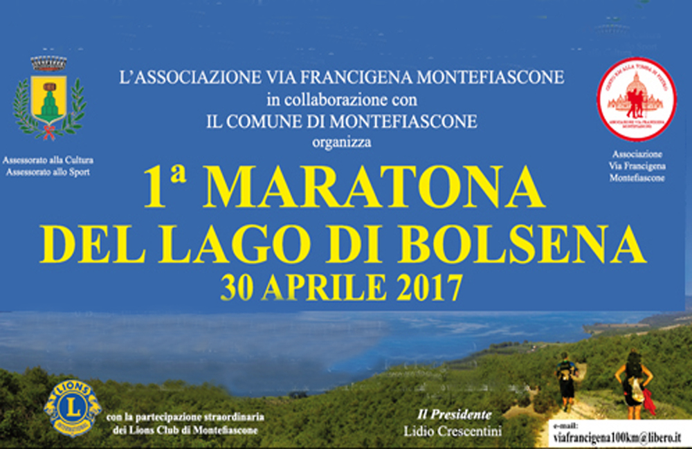 Organizzata dalla Associazione Via Francigena di Montefiascone, con il patrocinio dello stesso comune la 1a Maratona del Lago di Bolsena è fissata per il 30 aprile prossimo, con iscrizioni già aperte sino al 20 aprile.