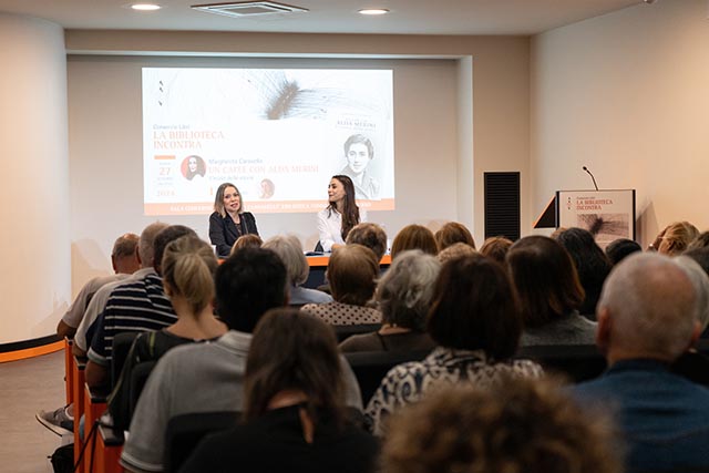 “Ho lavorato sulle emozioni, su quanto incidono le relazioni nello sviluppo dell’identità del singolo, sulle contraddizioni che ci compongono e che ci rendono, per questo, unici e sorprendenti”. Margherita Caravello, con una capacità affinata dal teatro in quanto anche attrice, il mix voce, postura non ingessata, occhi ridenti, dizione perfetta, ha saputo trasferire passaggi e aneddoti di una vita, quella della scrittrice milanese, pienamente vissuta tra dolore, ansie, pregiudizio in uno scenario che inquadra un lungo cammino di vita in cui la “poeta”, come amava farsi chiamare Alda Merini, e la donna hanno fatto prevalere sempre la propria libertà, alle prese con le resistenze sociali dall’inizio alla fine della sua esistenza, nel profondo dell’anima ha sempre tutelato la propria integrità con uno sguardo rivolto verso un mondo che prima di tutto ha saputo riconoscere e far proprio, quello degli ultimi che ha sempre portato con sé. Il libro ha la capacità di mettere a fuoco la prima parte della vita di Alda Merini, che Caravello ha saputo tratteggiate con aneddoti curiosi e colorati, avvalorandone il meglio della poesia, perché in fondo la vita di Alda Merini è una Poesia, che vive nel presente, nella contemporaneità, in cui dolore e coraggio l’hanno resa forte e libera attraverso la parola, elevandola dal crollo alla rinascita. Al pubblico, nello stile della Biblioteca, sono state donate copie del libro. Domenica 13 ottobre, alle ore 18.00, al Teatro San Leonardo appuntamento con la versione teatrale.