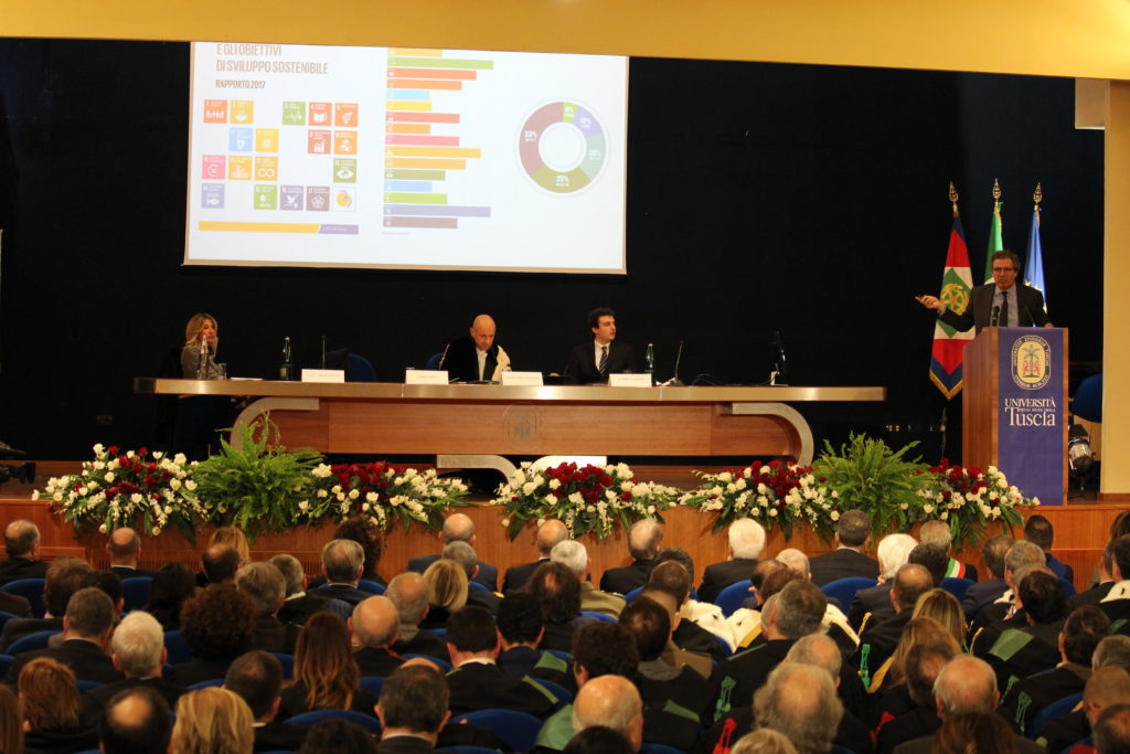 Futuro, presente, passato. In tre ore di una mattina in cui il sole fa fatica a sgusciare dalle nuvole, Viterbo offre al presidente della Repubblica altrettante immagini di se stessa: non contraddittorie, ma complementari. Una università che sta guadagnando punti in qualità e autorevolezza, con un bilancio in tempo reale che è più che gratificante. Una realtà sempre più inserita in una città che porta il segno indelebile e prezioso di quel che fu, rappresentato dal culto e dallo spirito che aleggia attorno a Santa Rosa. La prima tappa di Sergio Mattarella è l’Unitus. Una rapida visita al complesso monumentale, pochi istanti per ricevere una maglietta donata dagli studenti. Il presidente è accolto all’esterno dell’Auditorium dal rettore, Alessandro Ruggieri, e dal sindaco Giovanni Arena. All’interno il coro universitario intona l’Inno di Mameli. In platea, affollatissima, tutte ma proprie tutte, le autorità istituzionali, politiche, amministrative, imprenditoriali della Tuscia. Si inaugura l’anno accademico 2018-2019. Dopo la relazione del Magnifico e gli interventi del rappresentante degli studenti Filippo Lazzari e di quello del personale tecnico e amministrativo Maria Adele Savino, il professor Marco Frey, ordinario di Economia presso la Scuola Superiore di Pisa, affronta il tema della sostenibilità ambientale. Tema che è il cuore di quasi tutto l’intervento (otto minuti) del Capo dello Stato: “In Italia molte delle emergenze, delle calamità naturali sono dovute, o aggravate, da una scarsa cura del territorio. Questa deve essere la priorità per l’Italia, non solo per la salvaguardia della bellezza ma è decisiva anche per lo sviluppo economico”. Una sollecitazione non casuale, se è vero che lo sforzo maggiore e più immediato di Unitus è concentrato proprio sulle dinamiche ambientali. Nelle parole di apertura di Mattarella l’augurio e lo sprone a percorrere questa strada: “Quaranta anni sono molti anche per una università giovane come questa della Tuscia anche se già nel 1546 fu fondato qui uno Studium in città. Oggi questo ateneo ha aperto i propri orizzonti come stanno a testimoniare i 138 accordi di cooperazione internazionale. Unitus ha contribuito a innalzare il livello culturale del territorio”.