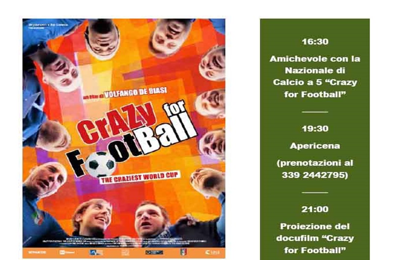 IL PROGRAMMA: 16:30 Amichevole fra la Nazionale di calcio a 5 “Crazy for Football” campione del mondo, allenata dal CT Enrico Zanchini, e una squadra di calcio locale 19:30 Apericena solidale per conoscerci e celebrare in amicizia il primo anno di un cammino coraggioso che desideriamo continuare insieme 20:30 Presentazione dell’associazione COMIP e delle attività svolte nel suo primo anno di vita per promuovere la prevenzione in salute mentale e dare voce ai giovani caregiver, figli di genitori con un problema di salute mentale 21:00 Proiezione a ingresso libero del docufilm “Crazy for Football” che promuove l’inclusione sociale, la lotta allo stigma e la salute mentale attraverso lo sport Intervengono: – Santo Rullo, psichiatra, ideatore del progetto “Crazy for Football” – Stefania Buoni, presidente e co-fondatrice di COMIP – Gaia Cusini, vice presidente e co-fondatrice di COMIP – Carlo Miccio, autore del romanzo “La Trappola del Fuorigioco” e co-fondatore di COMIP Invitati: il regista Volfango De Biasi, lo sceneggiatore Francesco Trento, l’allenatore della Nazionale “Crazy for Football” Enrico Zanchini, il preparatore atletico Vincenzo Cantatore. COME RAGGIUNGERCI: l’Auditorium della Parrocchia di Orte Scalo . Coinvolgere la cittadinanza per una vera e propria festa dedicata al benessere di ognuno di noi, all’amicizia e al fare rete! Solo così si può vincere una sfida impossibile.
