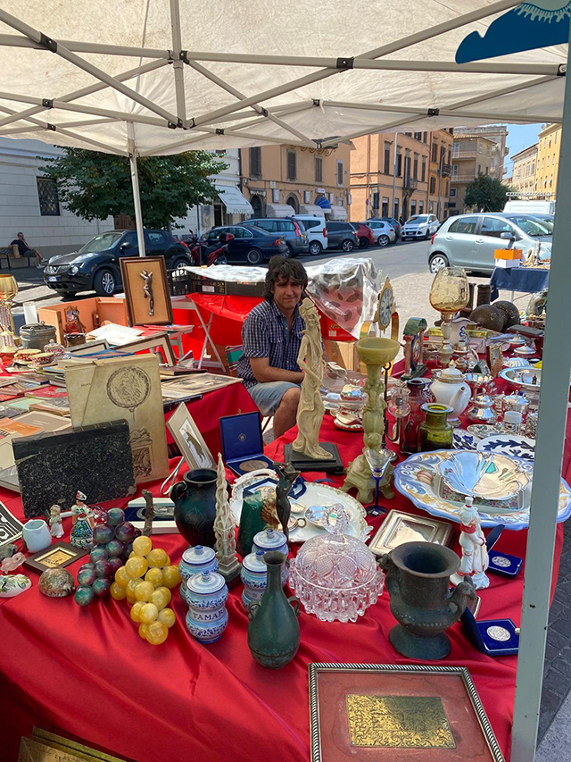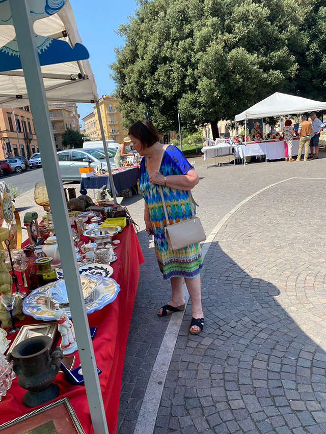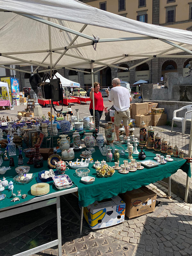 La piazza del Sacrario diviene sempre più location di eventi, obbligando durante l’anno lo spostamento del Mercatino dell’Antico, perchè allora non pensare di mantenere questa chicca a piazza della Rocca?. Potrebbe anche allargare il numero di espositori, vi assicuriamo che la qualità regna sovrana su queste bancarelle,dove si può trovare anche in questa domenica della porcellaneria meravigliosa, oltre a quadri ad olio di buona fattura, ma anche stampe di autori contemporanei come Modigliani, a partire da 5 euro. C’è anche un espositore con binocoli e macchine fotografiche di pregio.Un buon flusso di visitatori provenienti da Roma e dall’Umbria. Andate e soffermatevi, sicuramente anche la piazza della Rocca con la sua Fontana e il  Museo Etrusco si propongono come  una magnifica visione. Fino al tramonto si può.