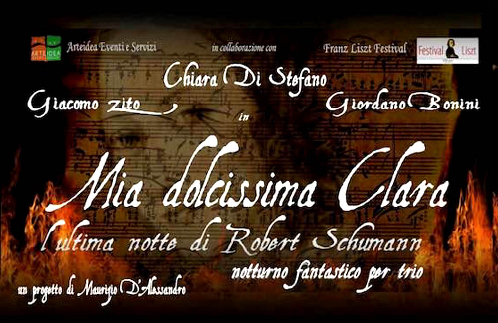 Sul palco Chiara Di Stefano, Giordano Bonini e Giacomo Zito, con musiche di Robert Schumann a cura di Maurizio D’Alessandro. La morte di Schumann, uno dei più grandi compositori del Romanticismo, rimane avvolta nel mistero. Clara Wieck, sua moglie e celebre pianista, amorevolmente dedita al marito, mette in luce una sorprendente freddezza: non va mai a trovarlo dopo il ricovero in una clinica psichiatrica di Bonn e gli impedisce di vedere i figli.